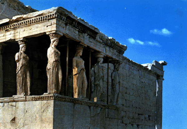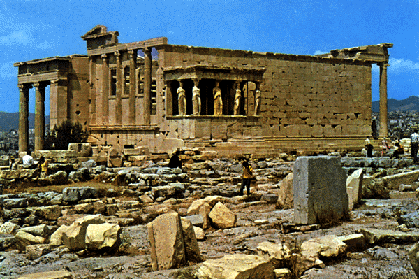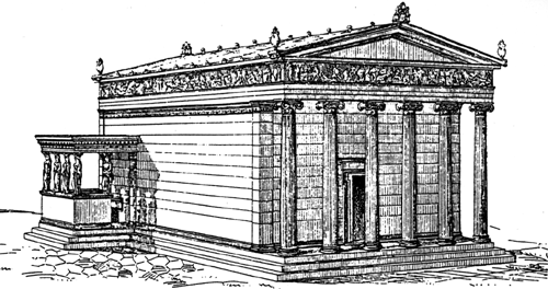 Hasonló szemlélettel épültek az együttes további épületei is. A Propylaia oszlopos kapuépítményével a sziklaoromra helyezett, sudár jón oszlopokkal díszített Niké templom és a Pinakotheka tart egyensúlyt. Az Erechteion (10. kép) is jón stílusú templom. Hármas tagozódású tömegét egy függőleges központi tengely köré komponálták. Az épület változatos megjelenését fokozza, hogy zárt tömegű és nyitott tömegek váltogatják egymást: a Partheonnal szemben álló csarnok építményen a jón oszlopokat törékeny, kedves női alakok, a "kariatidák" támasztják alá (35. ábra), (11. kép).
