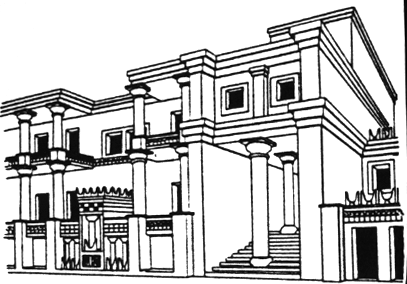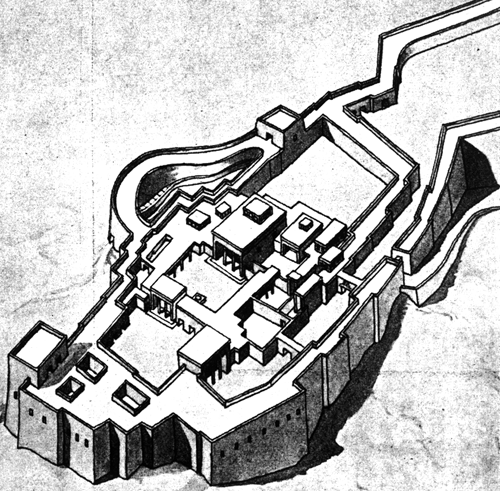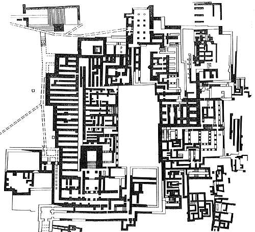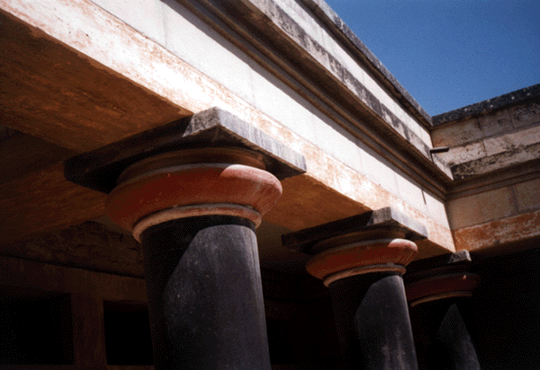 A korszak egyik jellegzetes épületegyüttese a knosszoszi palota (26. ábra), (6. kép). A palota központjában 30x55 méteres nagy belső udvar helyezkedik el, ennek nyugati oldalán voltak a reprezentatív helyiségek - trónterem és két, középen két-két pillérrel alátámasztott térség - talán szentély vagy más, kultikus célokat szolgáló helyiség. Az épület több emeletes volt. A trónterem felett fogadótermek, máshol raktárak és a palota személyzetének lakóhelyiségei voltak találhatók. Maga a királyi lakosztály az udvartól délre kapott helyet, több szinten. Az egyes szinteket sajátos kialakítású lépcsőterek kötötték össze, ezeket oszlopfolyosókkal szegélyezett világító udvarok gazdagították. A palota helyiségeit fények, árnyékok, sajátos átlátások, különös térkapcsolatok gazdagították és adtak a belső terek sorának emberséges, barátságos hangulatot.