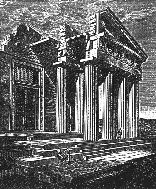A rövidebb homlokzatokat a nyeregtető oromzatát letakaró, lapos háromszög (timpanon) takarta. A templom alacsony alépítményen állt, a szintkülönbséget három fellépőből álló, körbefutó lépcsősorral hidalták át. A lépcsők a templomot körbefogó tornácra (pteroma) vezettek. A templom belső tere a templom tömegének egészéhez mérten igen kicsiny volt, csupán az isten szobor felállítására szolgált. Maga az istentisztelet a természetben folyt, a templom körül.
