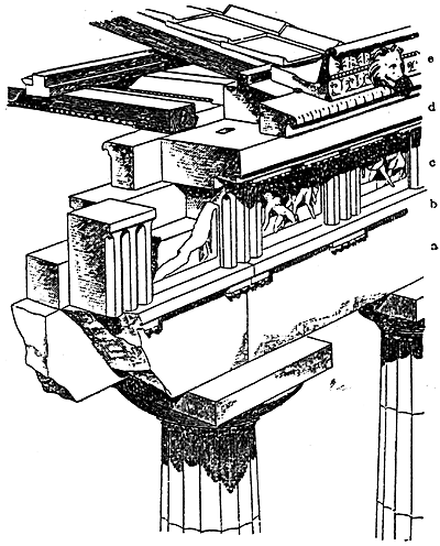 A görög templomok közül a dór stílusú templom típusa alakult ki legkorábban. Lényegében a tornácos, oromzatos, lapos nyeregtetővel fedett fa templomot alakították át lépésről-lépésre kő szerkezetűvé. A fa templom szerkezeti felépítését és a konstrukció egyes elemeit megtartották, a tagozatok méreteit és arányait azonban az alkalmazott kő szerkezetek tartószerkezeti tulajdonságaihoz igazították (31. ábra).