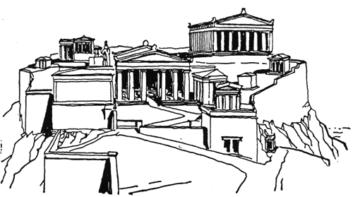 Az együttes tervek alapján épült fel: központi templomának, a Parthenonnak (34. ábra), (8. kép) (447-438) tervezőit is ismerjük. Az építész Iktinosz volt, segítőtársai Kallikratész, a szobrász Pheidiász és Anaxagorász, a filozófus. A Propylaiát Iktinosz tanítványa, Mnesziklész tervezte. A kelet-nyugat irányú sziklahátat fallal vették körül, melyhez elegáns kapuépítményt (Propylea) építettek. A 8 x 17 oszlopos dór peripterosz, a Parthenon az együttes hossztengelyéhez igazodik. Az épületek elhelyezése a hossztengelyhez igazodik, de a kompozíció egészében mégis aszimmetrikus.