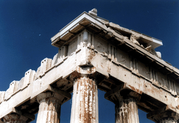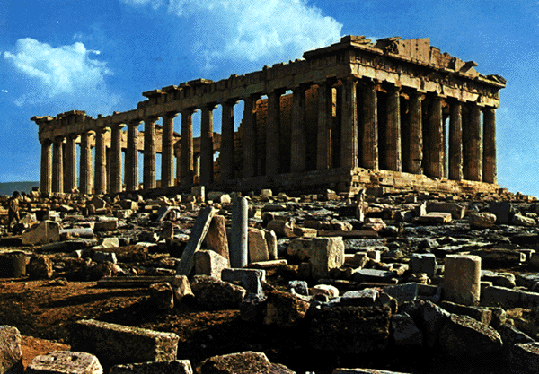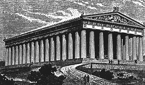 A Partheon épületének megformálása során Iktinosz és társai az addigi templomépítészet minden tapasztalatát felhasználták. (9. kép) A látvány javítását - optikai korrekció - számtalan eszköz szolgálta (az alapsík domborítása, a vízszintes vonalak ívelése, a falsíkok enyhe megdöntése, a sarokoszlop megszélesítése). Az épületet finom szemcséjű pentelikoni márványból építették, rendkívül pontos munkával. A belső teret két, emeletes oszlopsor osztotta hajókra, az oszlopok a bejárattal átellenes, hátsó oldalon befordultak. Ebben a viszonylag tágas térben kapott helyet Pheidiász alkotása, az elefántcsontból faragott, arannyal díszített Athéné szobor.