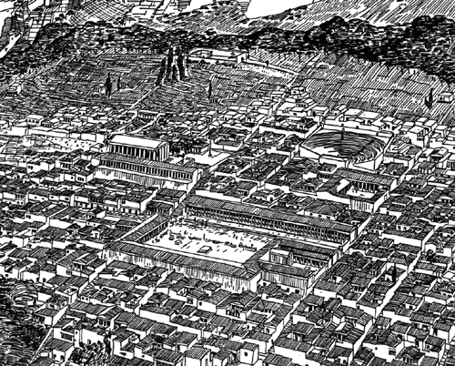 Az Akropolisz együttesének kompozíciója elárulja, hogy a görögök a nagyobb együttesek megformálásában is nagy tudással rendelkeztek. Megmutatkozik ez városépítészetükben is. A legrégebbi városok alaprajza a természetes adottságokhoz, a domborzat jellegzetességeihez igazodtak. Ezek az organikus - a természeti adottságok szerint "szabályos" - települések később háborúk áldozatai lettek. Helyükre szabályos, hálós alaprajzú városokat emeltek. A kolóniák - gyarmatok - települései már eredetileg is egyenes, derékszögű utcákkal épültek, nagyjából azonos lakótömbökkel. A középületeket és a városi tereket egy-egy "kihagyott" lakótömb helyén létesítették. A legismertebb városrendező Hippodamosz volt: legjelentősebb műve a perzsák által lerombolt Milétosz újjáépítése volt.